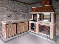 В стандартном варианте отделка столешницы, вертикальных колонн и горизонтальных полос выполнена из керамогранитной плиткой, а труба, крыша и стены - из мраморной крошкой. Ниша для дров темно-коричневого цвета - без отделки. Задняя часть барбекю - без отделки.