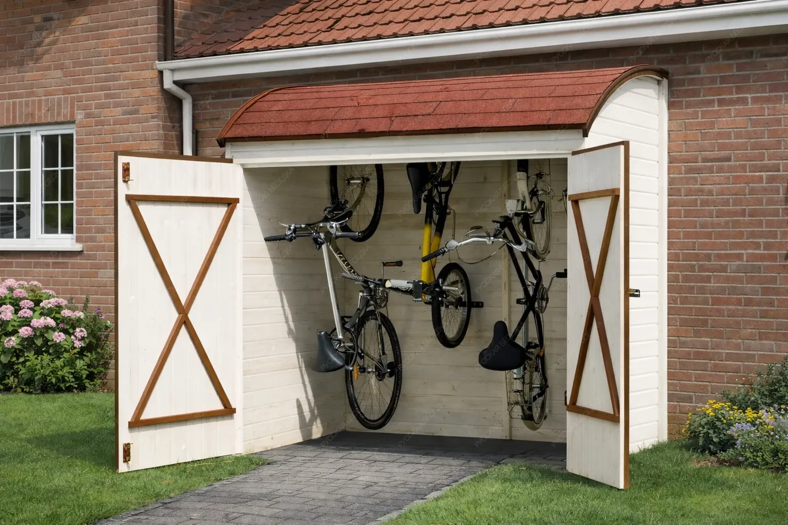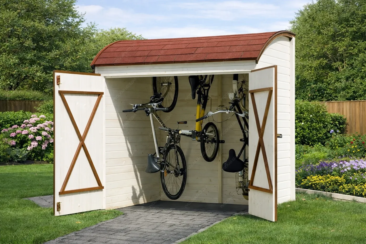 Деревянный гараж для велосипедов — это продуманное решение для хранения двухколёсной техники и сопутствующего инвентаря. Компактное строение из натурального дерева защищает велосипеды от дождя, снега, ультрафиолета и перепадов температур, продлевая срок службы узлов и сохраняя внешний вид рам. Внутреннее пространство организовано с учётом потребностей активных людей: предусмотрены удобные полки для шлемов, насосов, инструментов и смазочных материалов, а также крючки для подвешивания покрышек, велокомпьютеров или рюкзаков. Такая система хранения позволяет быстро найти нужную вещь и поддерживать порядок без лишних усилий. Изготовленный из качественной древесины, гараж гармонично вписывается в ландшафт загородного участка или городского двора, не нарушая эстетики окружающей среды. Дерево обеспечивает естественную вентиляцию, предотвращая образование конденсата, который вреден для металлических деталей. Конструкция рассчитана на длительную эксплуатацию и может быть выполнена в различных размерах, чтобы вместить от одного до нескольких велосипедов. Надёжные крепления и устойчивость к ветровым нагрузкам гарантируют сохранность имущества даже в сложных погодных условиях. Аккуратное размещение велосипедов освобождает полезную площадь гаража, сарая или балкона, делая повседневную жизнь более комфортной и организованной.