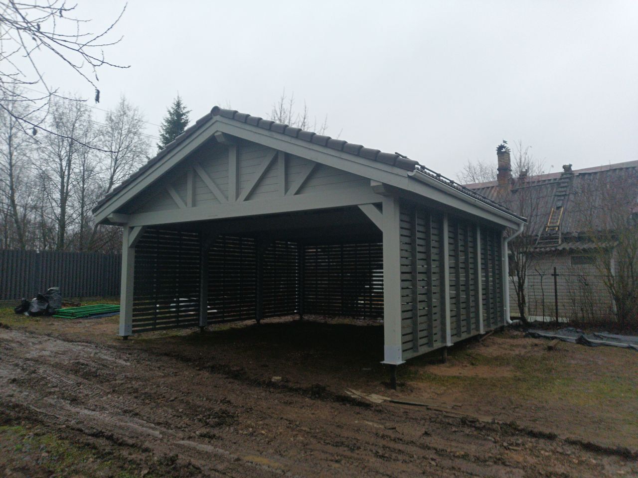 Навес из дерева послужит отличным парковочным местом для одного или нескольких автомобилей.