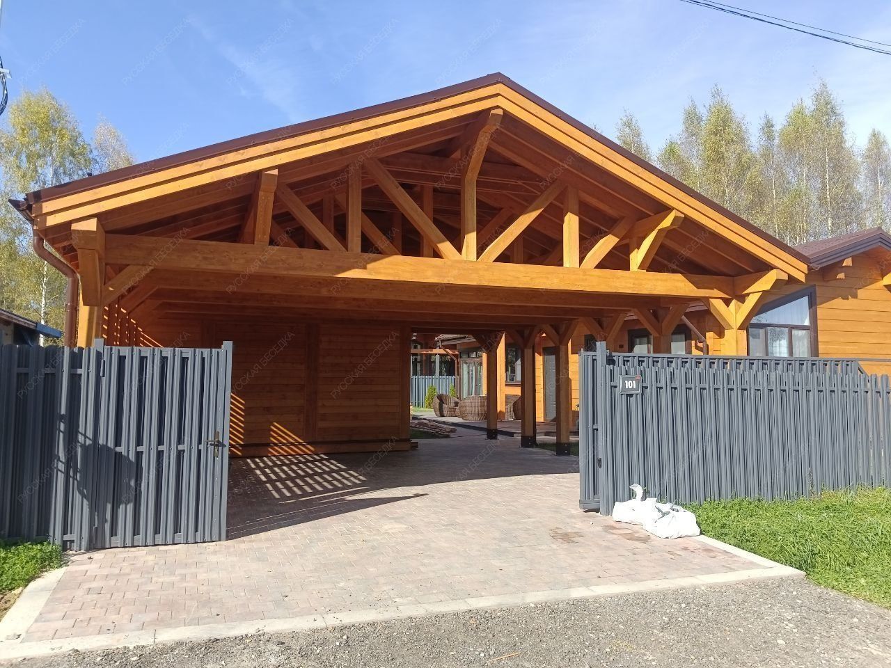 Навес из дерева послужит отличным парковочным местом для одного или нескольких автомобилей.
