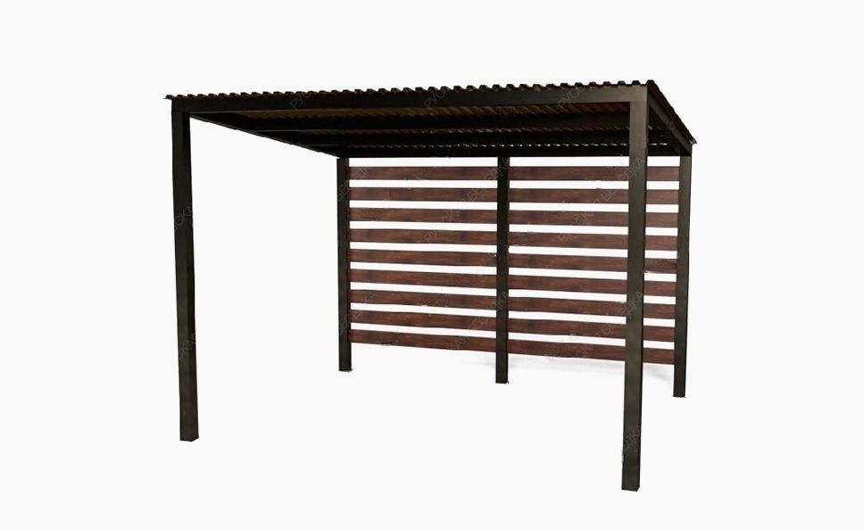 Навес «Патио – 2» очень популярный, его можно использовать и для установки под его крышей печки под казан, мангала или тандыра, можно сделать беседкой для чаепития, а можно использовать и как беседку для курения. Прочный каркас с массивными ножками, крыша из профлиста, задняя стенка обшита сосновыми брусками – все это делает конструкцию навеса долговечной и надежной.