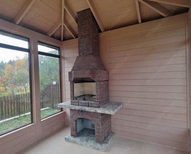 Модель №6 украшена керамической плиткой, которая выполняет в том числе и практическую функцию. Такую плитку легче мыть, а еще в ней нет пор, в которые будут забиваться остатки продуктов, что делает поверхность гигиеничной при правильном уходе. Плиткой отделана как столешница комплекса барбекю, так и место для хранения дров.